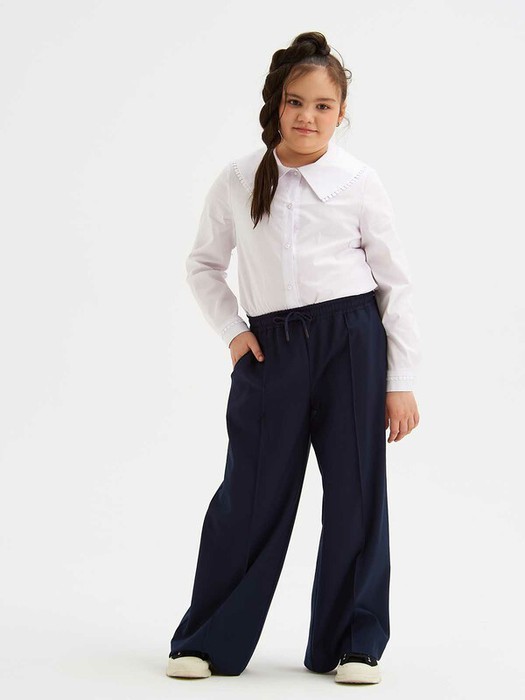 Брюки палаццо для девочек изготовлены из немнущейся костюмной ткани высокого качества, которая идеально подходит для брюк данного фасона. Расширяющийся от пояса силуэт, высокая талия и пояс на резинке не стесняют движений. Брюки имеют карманы достаточной глубины. Брюки палаццо элегантно смотрятся на девочках любого роста.