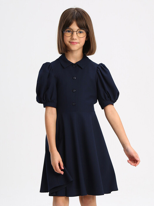 Платье с короткими объемными рукавами из костюмной поливискозы, с отложным воротником из основной ткани. Отрезное по талии с центральной застежкой на 4 пуговицы и юбкой-полусолнце с карманами в боковых швах. По спинке платье дополнено не съемным полупоясом для возможности регулировки по талии.