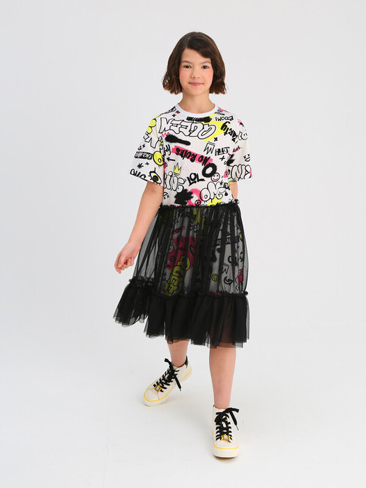 Модное платье-футболка с юбкой из сетки подойдет для ярких летних образов юной модницы. Нежная ткань из трикотажа приятно прилегает к телу, хорошо тянется и обладает высокой воздухопроницаемостью. Благодаря свободному крою оверсайз, платье отлично подойдет для активных игр ребенка и повседневных прогулок. Платье-футболка в спортивном стиле — это тренд, который актуален уже не первый сезон, а сетчатая юбка со стильным принтом сделает образ оригинальным.