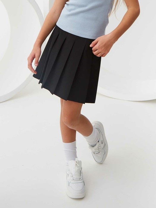 Короткая юбка в складку. Эластичная костюмная ткань из поливискозы. Трапециевидный крой со средней посадкой талии. Пояс с внутренней регулируемой резинкой. Потайная застежка-молния в боковом шве. Размерный ряд 128 – 176 см.