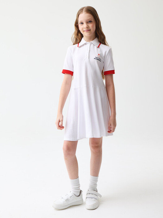 Короткое платье в теннисном стиле. Мягкий хлопковый трикотаж пике. Трапециевидный крой с отрезной талией и расклешенной юбкой. V-образный вырез. Декоративная полоска на воротнике, в проймах и по линии талии. На груди контрастный принт воланчика и надписью SPORT CLUB BADMINTON (с англ. «спортивный клуб бадминтона»). Размерный ряд 128 – 176 см.