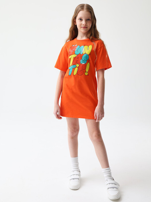 Платье-туника оверсайз силуэта с ярким принтом FANTASTIC! (с англ. «фантастический!»). Мягкий трикотаж из 100% хлопка. Свободный крой со спущенной линей плеча. Круглый вырез горловины и короткий рукав с манжетами. Прямой силуэт, спереди платье на пару сантиметров короче, по бокам небольшие разрезы. В боковых швах функциональные прорезные карманы. Размерный ряд 128 – 176 см.