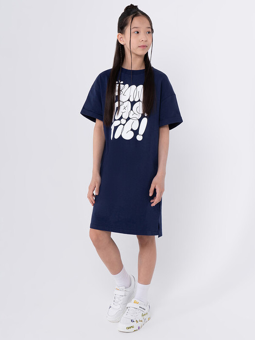 Платье-туника оверсайз силуэта с ярким принтом FANTASTIC! (с англ. «фантастический!»). Мягкий трикотаж из 100% хлопка. Свободный крой со спущенной линей плеча. Круглый вырез горловины и короткий рукав с манжетами. Прямой силуэт, спереди платье на пару сантиметров короче, по бокам небольшие разрезы. В боковых швах функциональные прорезные карманы. Размерный ряд 128 – 176 см.