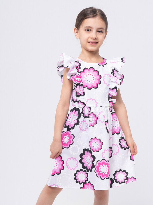 Платье летнее без рукавов из смесового хлопка с крупным орнаментом. Прилегающий верх и расклёшенная отрезная юбка с мягкими складками делают силуэт неотразимым. Аккуратный вырез горловины подчёркивает красоту шеи. На груди и спике акцентные валаны.