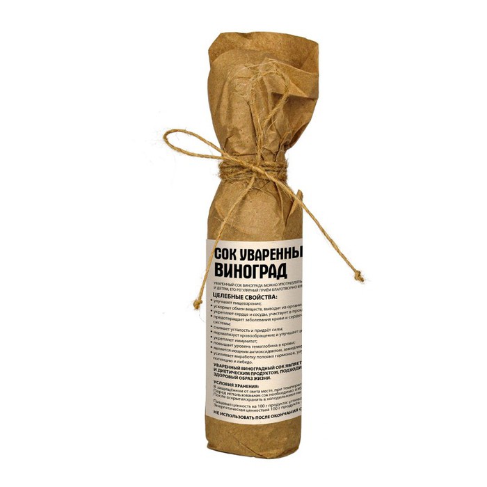 Уваренный виноградный сок изготовлен из свежих ягод винограда. Сгущённый концентрированный сок получают методом тепловой обработки и процеживания, без загустителей, красителей и консервантов. Готовый продукт сохраняетвсе полезные свойства свежих ягод, витамины и микроэлементы: В1, В2, Е, РР, калий, магний, кальций, цинк, железо, натрий, фосфор, а также большое количество кобальта, йода и хрома. Виноградный сок — прекрасное целебное природное средство. Благодаря многочисленным полезным свойствам, он издавна применялся для ампелотерапии — лечения соком винограда.