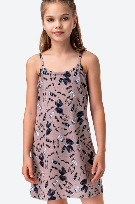 Детская ночная сорочка на тонких бретелях для девочек и девочек-подростков выполнена из натурального 100% хлопка. Благодаря спокойному бежевому цвету и оригинальному принту домашнее платье станет любимым атрибутом отдыха ребенка. Свободный крой сорочки для детей и подростков дарит комфорт и не стесняет движений.