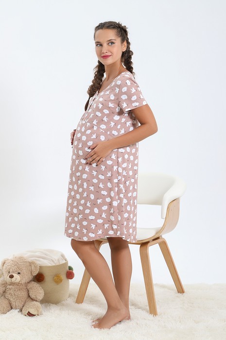 Сорочка женская из гладкокрашенного трикотажного полотна "кулирка" слегка расширенная книзу, с короткими втачными рукавами и горловиной овальной формы, обработанной притачной бейкой и фигурной линией низа. Перед - с отрезной кокеткой с разрезом по центру, обработанным притачными узкими планками и скрепленными между собой тремя пуговицами.