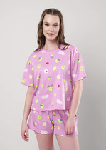 Женская сорочка выполнена из вискозного полотна с набивным рисунком. Горловина оформлена бейкой из основного полотна. Низ рукавов и изделия обметаны декоративным стежком "пике".
