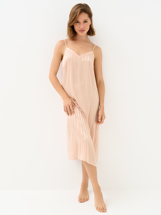 Женская длинная сорочка в полоску с V-образным вырезом, однотонным кантом, регулируемыми бретелями и разрезом слева.