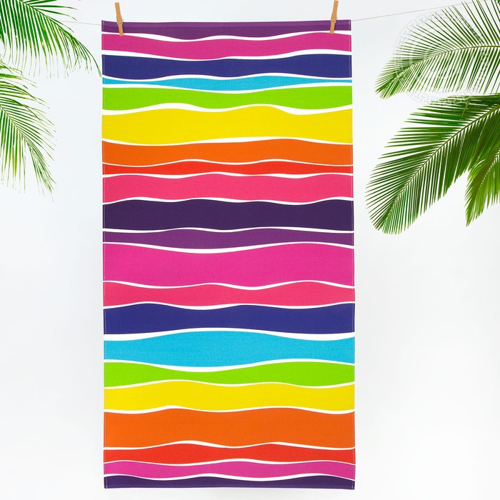 Вафельное пляжное полотенце «Спектр» привлечет внимание окружающих за счет своих ярких тонов. В дизайне полотна использованы яркие цвета – желтый, зеленый, голубой. Более нейтральные – розовый, оранжевый, красный. И темные – синий, фиолетовый. Рисунок пляжного полотенца выглядит летним, веселым благодаря разделению цветных полос белыми волнистыми полосками.
