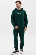 Спортивный костюм из хлопкового трикотажного полотна. Куртка прямая с воротником с фронтальной молнией. Рукава втачные. Карманы куртки прорезные . На груди куртки слева и на левой брючине под карманом - фирменный шеврон.. Воротник, манжеты и пояс куртки выполнены из полосатого эластичного трикотажа. Брюки прямые, с прорезными карманами .Пояс брюк эластичный, по линии талии дополнительно регулируется шнурком.