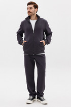 Мужской спортивный костюм из плотного трикотажа с петельной изнанкой. Верх комплекта - толстовка-худи с капюшоном, с накладным карманом "кенгуру". Рукава толстовки втачные, свободные со спущенной линией плеча, с эластичными манжетами. На тактических брюках "Карго" два объемных накладных кармана с клапанамии и еще два кармана в боковых подрезах. Брюки зауженны книзу на резинку. Пояс брюк на резинке, по линии талии дополнительно регулируется шнуром.