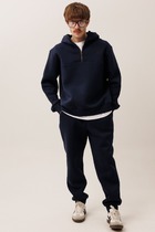 Спортивный костюм с капюшоном, из трехниточного плотного трикотажа с начесом по изнанке. Куртка-худи прямого силуэта. Рукава втачные со спушенной линией плеча. Кокетки куртки, капюшон и нижняя часть задней брючины продублированы водонепроницаемой плащевкой.Карманы накладные "кенгуру". Манжеты рукавов и брючин и пояс куртки из эластичного трикотажа. Брюки с прорезными карманами на молниях, Низ брюк заужен анжетами. Пояс брюк по линии талии с эластичной тесьмой, дополнительно регулируется шнуром.На груди и на брюках под карманом - термотрансфер с фирменным логотипом.