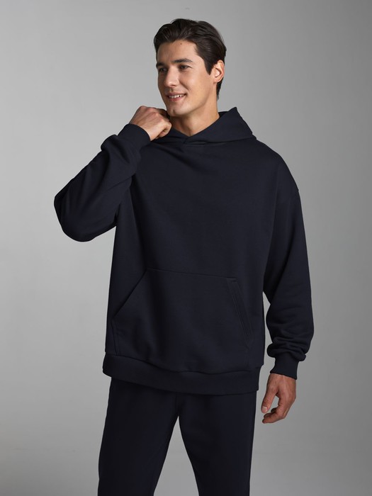 Мужской спортивный костюм из плотного трикотажа с петельной изнанкой. Верх комплекта - толстовка-худи с капюшоном, с накладным карманом "кенгуру". Рукава толстовки втачные, свободные со спущенной линией плеча, с эластичными манжетами. Брюки книзу заужены на резинку. Карманы брюк в боковых подрезах. Пояс брюк по линии талии дополнительно регулируется шнуром.