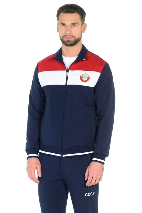Спортивный костюм из эластичного хлопкового трикотажного полотна. Куртка на молнии с воротником-стойкой. Карманы на куртке и брюках прорезные с листочками на молнии. Посадку по фигуре обеспечивает эластичное трикотажное полотно с полосами по воротнику, поясу и манжетам. Брюки прямые. Эластичный пояс брюк по линии талии дополнительно регулируется шнуром. На левой полочке вышивка "герб СССР" шелковыми нитями, на брюках вышивка СССР. На спинке аппликация "СССР".