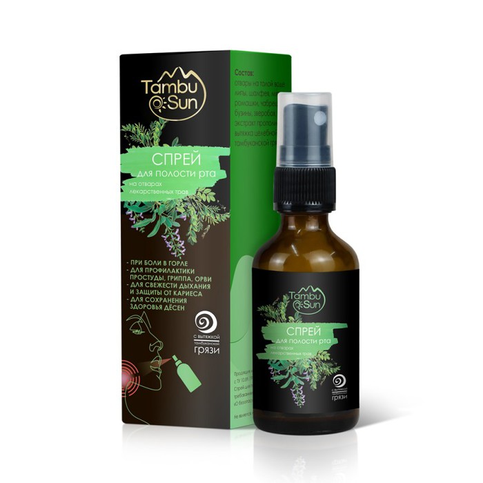 Состав: отвары на талой воде липы, шалфея, мяты, ромашки, чабреца, бузины, зверобоя, экстракт прополиса, вытяжка целебной тамбуканской грязи. Способ применения: поднесите вертикально флакон ко рту, проведите ингаляцию, распылив средство 1-2 раза. Использовать спрей можно 2-3 раза в сутки. Растительный состав спрея для горла «TambuSun» применяется в народной медицине в качестве профилактики заболеваний ЛОР-органов, а также для поддержания гигиены полости рта. Целебная вытяжка тамбуканской грязи выступает в качестве проводника полезных компонентов растений в составе, хорошо закрепляясь на стенках горла, помогает при простудных покраснениях горла. Липа может помочь облегчить дыхание, повысить местный иммунитет, успокоить першение. А мята, шалфей и ромашка в комплексе способны освежить дыхание, сохранить комфорт в горле на протяжении нескольких часов, поддерживая влажность слизистой оболочки.