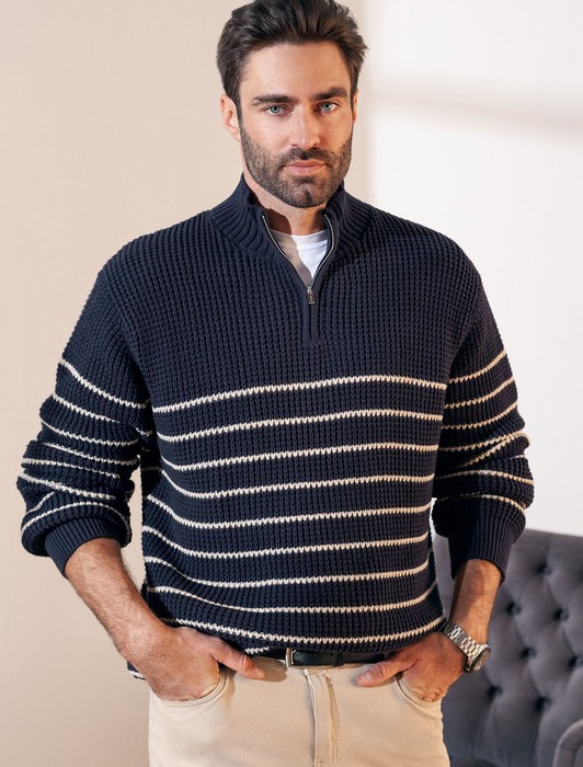 — Свитер фактурной крупной вязки с металлической молнией