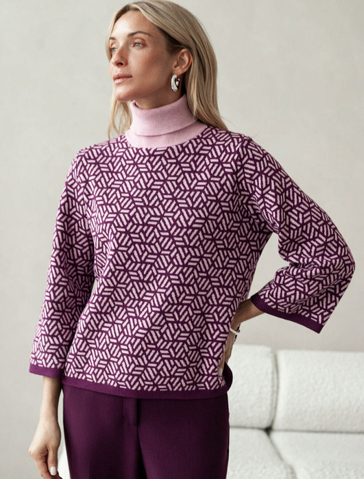 Свитер жаккардовой вязки выполнен из нежной пряжи на основе вискозы с добавлением кашемира. Модель свободного силуэта с укороченным рукавом подходит для любой фигуры. Жаккардовый узор выглядит дорого и роскошно, делая любой образ респектабельным. Нежная пряжа комфортно ощущается на теле, сохраняя оптимальное тепло при этом не перегревая