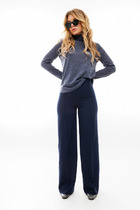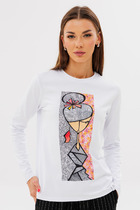 Свитшот свободного кроя, выполнен из трикотажной хлопковой ткани. Рукав втачной со спущенной проймой, низ рукава обработан довязом с нитью из люрекса, как на манжете, так и на горловине. V - образный вырез визуально удлиняет шею. Разрезные детали из контрастной расцветки выгодно создают нужные линии и зрительно вытягивают силуэт.