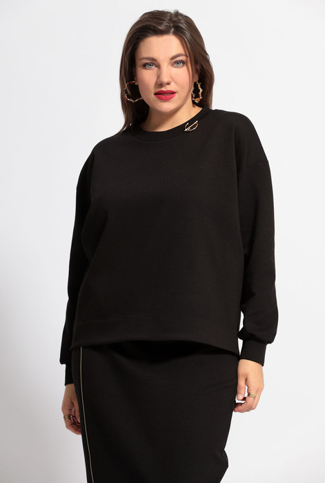 Свитшот декорирован брошью. Горловина полукруглая, обработана притачной обтачкой. Рукав со спущенной линией плеча, низ которого на манжете из основной ткани. Спинка длиннее переда и имеет форму полукруга по низу.