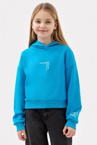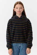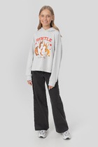 Свитшот прямого силуэта с втачными длинными рукавами, по линии низа имитация текстильной рубашки. Изделие выполнено из полотен контрастного цвета и разной текстуры, на полочке есть принт. Горловина круглая и обработана притачной бейкой. В качестве дополни