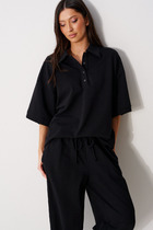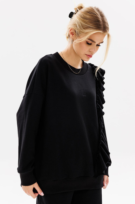 Современный, женственный свитшот, покроя oversize из комфортной ткани (футера пенье). Волан с необработанным краем (укреплён строчкой для надежности) пришит асимметрично на левой стороне изделия. Свитшот имеет спущенную линию плеча, прямой силуэт и притачную манжету по низу изделия. По центру переда вышивка – логотип в цвет ткани. Рукава с притачной по низу манжетой. Бейка горловины, низ изделия и манжеты рукавов выполнены из ткани - компаньона кошкорсе.