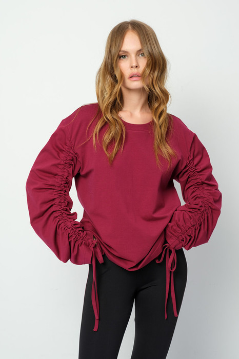 Детали: прямой силуэт, круглая горловина, рукава втачные со сборкой и завязками, при помощи завязок и можно регулировать длину рукава.