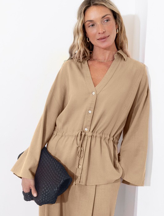 Состав: 70%Вис 30%Лен Плотность: 200 Г/м2Свободная блузка бежевого цвета с кулиской на талии изо льна с вискозой, плотностью 200 Г/м2 - идеальный вариант для весны и лета. Сочетание льна и вискозы обеспечивает комфорт и прохладу в жаркие дни. Материал хорошо драпируется и мягко прилегает к фигуре, создавая струящиеся складки. Эта эффектная блузка сочетает в себе современный крой, удобство и стиль. Отложной воротник придает образу элегантность, спущенная линия плеча — модный и расслабленный акцент, а широкий рукав создает красивый и воздушный силуэт. Талия оформлена утягивающей кулиской, что позволяет регулировать посадку — создайте акцент на поясе для женственного силуэта или носите свободно для комфорта, отлично скроет возможные недостатки. Пуговицы по всей длине делают льняную рубашку особенно практичной, вы можете носить ее растегнутой, как верхний слой. Эта легкая блузка подходит для повседневного гардероба, смотрится красиво и стильно, обеспечивая максимальное удобство, подойдет и на большие размеры.