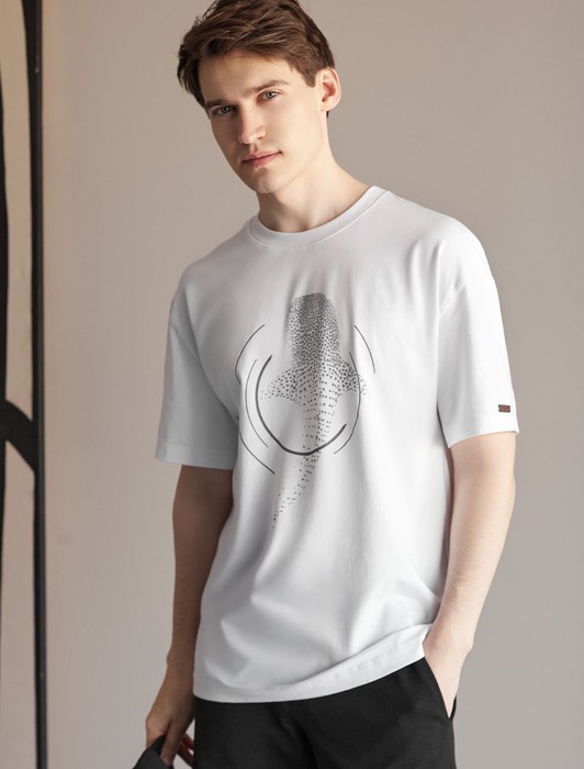Состав: 92%Хлопок 8%ПУ Плотность: 170 Г/м2Футболка свободного кроя выполнена из премиального хлопка. Авторский принт нанесен красками с устойчивым покрытием. Благодаря эластану, носить изделие очень комфортно, и оно сохранит свой безупречный вид в течение долгого времени. На рукаве нашивка из эко-кожи с логотипом бренда.