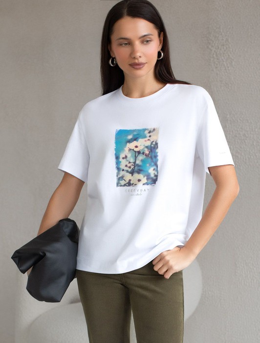 Состав: 92%Хлопок 8%ПУ Плотность: 170 Г/м2Модная футболка белого цвета привлекает внимание своим интересным дизайном и ярким принтом. Благодаря прямому крою изделие комфортно садится на любую фигуру, в том числе на большие размеры, и не сковывает движений. Круглый вырез подчеркивает современный стиль, а натуральный материал из хлопка с добавлением эластана обеспечивает удобство в повседневной носке и приятные тактильные ощущения. Прочность и износостойкая структура позволяют сохранять свежий внешний вид после множества стирок. Принт в виде цветов и надписи нанесен красками с устойчивым покрытием, перевод надписи: Everyday essentials - Повседневные вещи, которые необходимы. Стильная футболка гармонично вписывается в любой гардероб и подойдет для прогулок, отдыха или неформальных встреч. Благодаря особенностям кроя модель хорошо сидит, скрывая недостатки и подчеркивая достоинства. Яркая футболка идеально сочетается с базовыми вещами, позволяя создавать новые интересные образы каждый день.