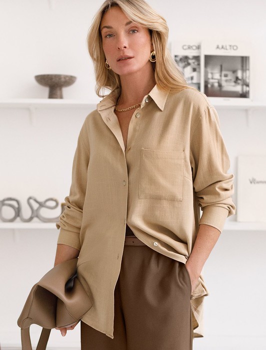 Состав: 70%Вис 30%Лен Плотность: 200 Г/м2Свободная удлиненная блузка с карманом бежевого цвета изо льна с вискозой, плотностью 200 Г/м2 - идеальный вариант для весны и лета. Сочетание льна и вискозы обеспечивает комфорт и прохладу в жаркие дни. Материал хорошо драпируется и мягко прилегает к фигуре, создавая струящиеся складки. Эта эффектная блузка сочетает в себе современный крой, удобство и стиль. Отложной воротник придает образу элегантность, спущенная линия плеча — модный и расслабленный акцент, а удлиненный крой создает красивый и легкий силуэт. Пуговицы по всей длине делают льняную рубашку особенно практичной, вы можете носить ее растегнутой, в качестве верхнего слоя. Длинная рубашка отлично подойдет на высокий рост, а так же на большие размеры, поможет скрыть возможные недостатки и сохранит при этом стильный образ. Легкая блузка подходит для повседневного гардероба, смотрится красиво, обеспечивая максимальный комфорт.