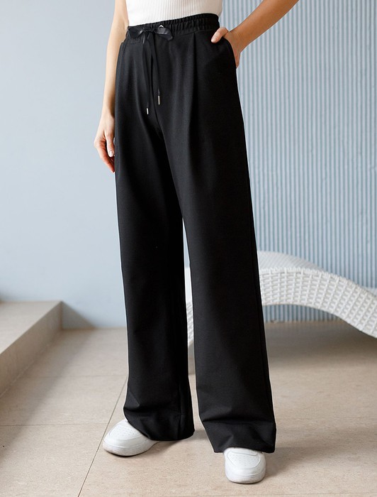 Состав: 75%Хлопок 20%ПЭ 5%ПУ Плотность: 260 Г/м2Брюки свободного кроя выполнены из эластичного футера-двухнитки. Модель дополнена защипами и боковыми карманами как у классических брюк и одним задним карманом. Эластичный пояс на резинке с шнурком из репсовой ленты и металлической фурнитурой. Брюки сочетаются в костюме с любым верхом из футера в черном цвете.