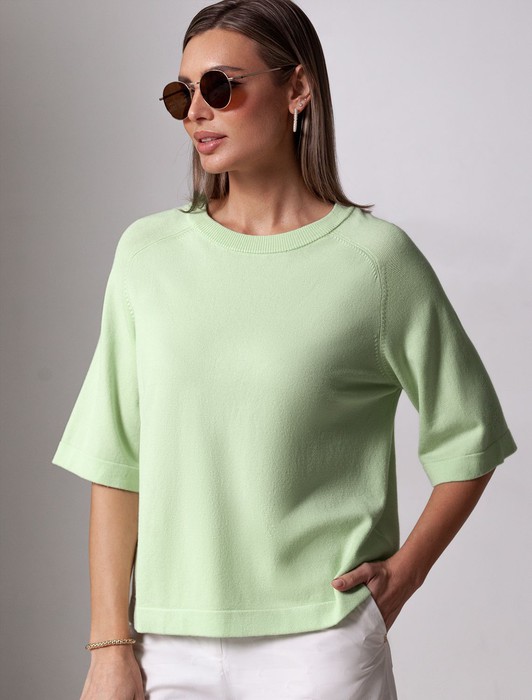 Состав: 80%Вис 20%ПАЛегкий свободный джемпер светло-зеленого цвета с круглым вырезом идеально подходит на весну и лето. Тонкая вязка из вискозы дарит приятный комфорт и ощущение свежести в теплую погоду. Универсальная длина позволяет сочетать джемпер с разными элементами гардероба. Джемпер отлично смотрится на больших размерах благодаря продуманному крою и свободному фасону. Широкие рукава создают воздушность и делают силуэт особенно женственным. Этот джемпер с рукавом 3/4 станет незаменимой частью гардероба в сезоны, когда хочется легкости и элегантности одновременно. Лаконичный дизайн обеспечивает простоту комбинирования с другими вещами и будет универсальной базой для создания разнообразных комплектов — от офисного до непринужденного городского стиля.