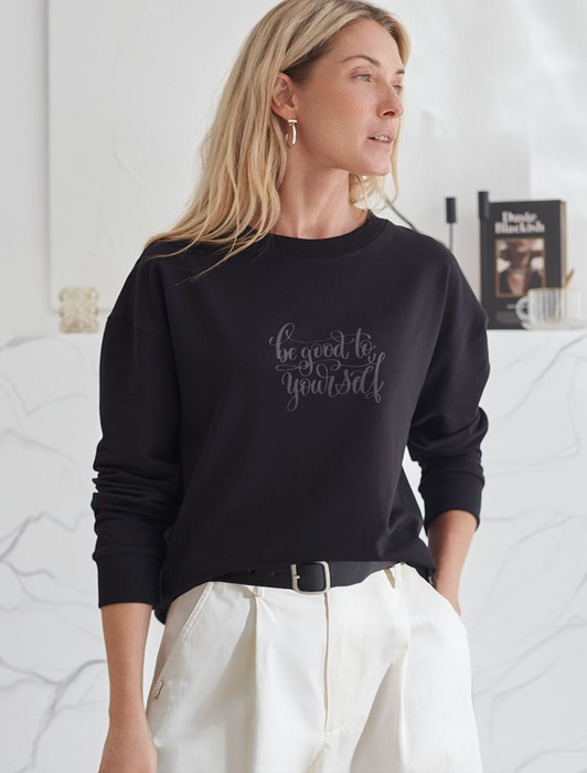 Состав: 95%Хлопок 5%ПУ Плотность: 240 Г/м2Стильный свитшот черного цвета из премиального футера двухнитки с эластаном сочетает в себе комфорт и оригинальность. Джемпер выполнен из натурального хлопка, который обеспечивает мягкость и дышащие свойства ткани. Нежный материал дарит ощущение уюта в любое время года, а премиальное качество изготовления гарантирует долговечность и сохранение формы после множества стирок. Особенность изделия — спущенная линия плеча и аккуратные разрезы, которые добавляют современный акцент и делают образ более выразительным. Принт в виде надписи придает индивидуальность, позволяя выделиться без лишней вычурности. Перевод надписи Be good Be yourself - Будь хорошей, будь собой. Дополнен металлическим логотипом бренда.