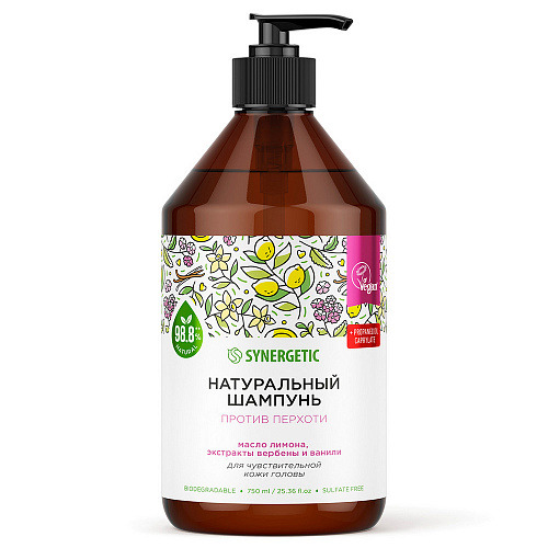 Бессульфатный шампунь Synergetic "Против перхоти для чувствительной кожи головы" — эффективное средство для очищения кожи головы и всех типов волос — более чем на 98% состоит из натуральных компонентов.