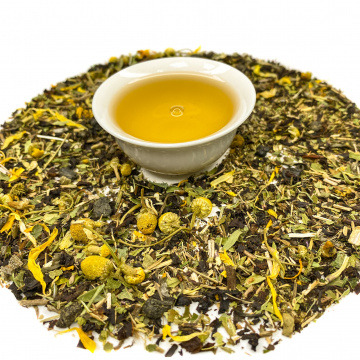 Чай черный, ганпаудер, чабрец, липа, ромашка, душица, мята, зверобой, шалфей, календула. Без ароматизаторов.