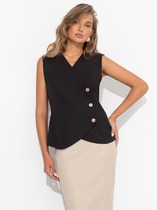 Жилет молодежный из трикотажного полотна «дабл-флис» (двухсторонний флис), прямого силуэта, с воротником «стойка», центральной бортовой застежкой на тесьму «молния». Для создания диагональных линий боковые швы переведены на полочку и оформлены в рельефные швы, в которых обработаны карманы.