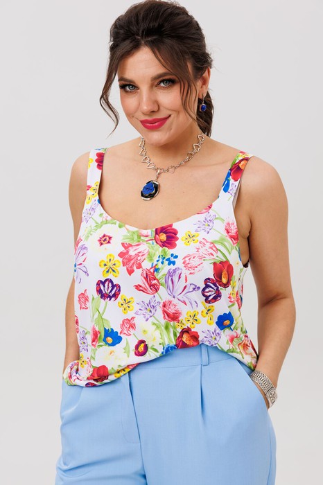 Топ в красочном цветочном принте «россыпь цветов» - лёгкий, нежный и наполненный настроением лета. Мягкая ткань с приятной фактурой деликатно струится, создавая ощущение лёгкости и естественной женственности. Яркий цветочный рисунок оживляет образ и добавляет ему свежести, делая топ выразительным, но при этом универсальным.