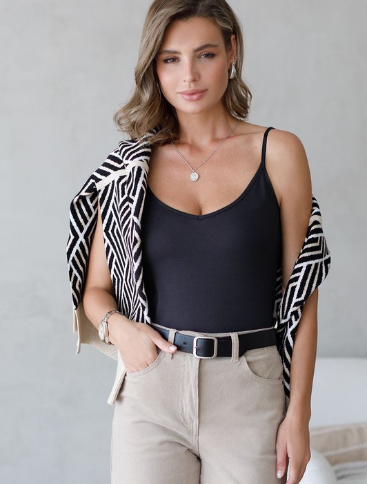 Состав: 92%Хлопок 8%ПУ Плотность: 140 Г/м2 Параметры модели на первом фото: Рост 170, бюст 89, талия 63, бедра 92 Размер товара на первом фото: 42Топ с V-вырезом выполнен из премиального хлопка. Модель дополнена регулируемыми бретелями, позволяющими носить изделие на нужном уровне. Эластичный материал гарантирует комфорт и формоустойчивость. Из украшений металлический логотип бренда.