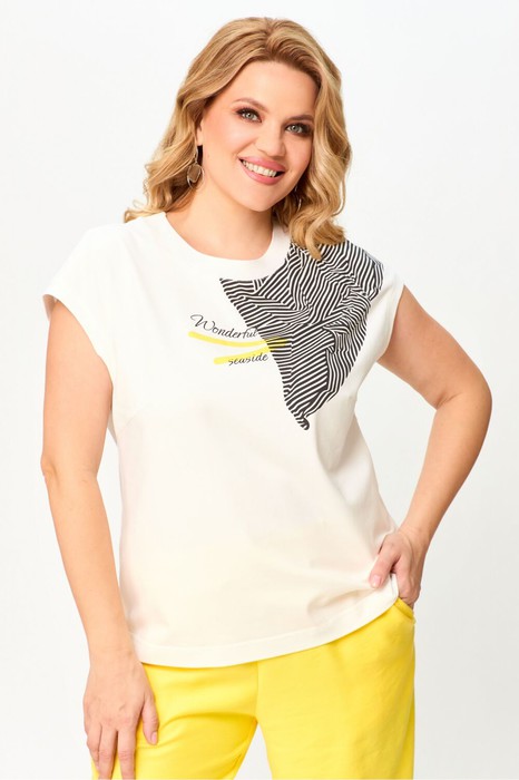 Джемпер женский, свободного силуэта, со спущенной линией плеча, длиной до линии бедер. На детали переда джемпера нанесена декоративная печать, вырез горловины округлой формы, с втачной декоративной бейкой. Проймы обработаны втачными бейками. Длина спинки – 62см.