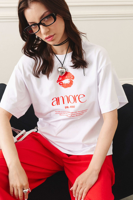 Футболка свободного кроя прямого силуэта, линия плеча спущена, рукав короткий, округлый вырез горловины обработан бейкой, по центру печать.