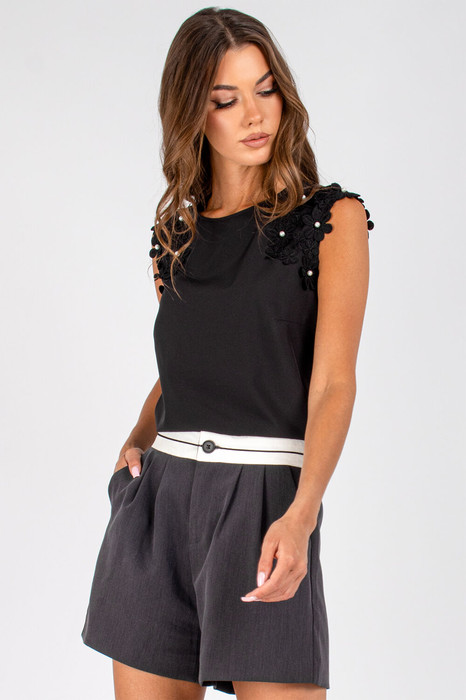 Отделочным элементом блузы является кружево, настроченное на верхней части переда и спинки. На кружево пришиты бусины.