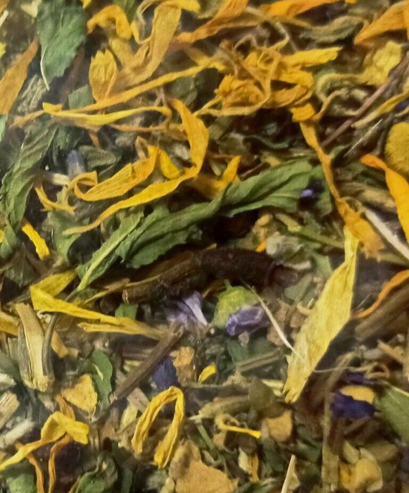 СОСТАВ: шалфей, ромашка, мята, календула, софлор, имбирь, гвоздика, лист земляники.При заваривании получается настой глубокого темно-орехового цвета, очень ароматный, с медовыми, тягучими нотками, с богатым вкусом, украшенным ягодно-фруктовыми тонами.Усиливает потребление калорий, сжигает жтровые отложения, подавляет аппетит, выводит из организма шлаки и токсины, стимулирует деятельность внутренних органов.