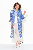 Туника прямого силуэта, с округлой горловиной, с ассиметричным низом, длиной до середины бедра. Рукав цельнокроенный, короткий, с манжетом. Боковые швы фигурно смещены на полочку. В нижней части полочки расположена вставка со шнурами-стяжками. Горловина обработана бейкой из основного полотна