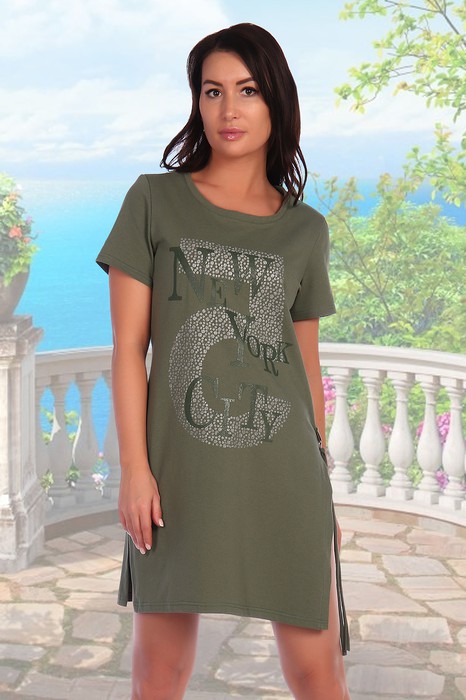 Туника прямого силуэта с коротким рукавом и круглым вырезом горловины. На полочке выполнена печать. От бедра по боковым швам расположены разрезы. С левой стороны через полукольцо продет декоративный шнур.