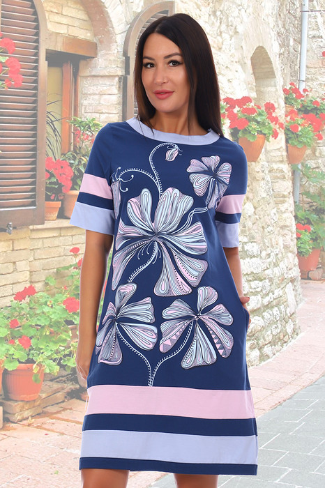 Туника женская выполнена из трикотажного полотна, 100% хлопок. Туника свободного кроя, с двумя внутренними карманами в боковых швах, на передней части выполнена декоративная печать, горловина обработана отделочным кантом, рукава и низ изделия оформлены вставками контрастного цвета.