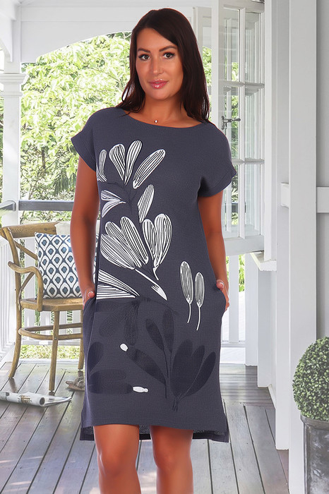 Туника полуприталенного силуэта с принтом из  трикотажа "соты", приятного к телу. Спущенная пройма, широкий манжет, горловина в виде лодочки, обработана обтачкой. В боковых швах удобные карманы, низ спинки удлинён, по бокам небольшие разрезы.