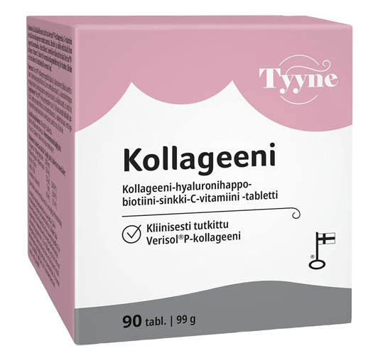 Tyyne Collagen — флагманский продукт Финляндии. Содержит клинически протестированный коллаген Verisol® P, гиалуроновую кислоту, витамин С, цинк и биотин. Без сахара, без глютена и без лактозы. Состав: коллагеновые пептиды Verisol®p (свинина), наполнители (дикальцийфосфат, гидроксипропилцеллюлоза), гиалуронат натрия, L-аскорбиновая кислота, эмульгатор (магниевые соли жирных кислот), цитрат цинка, d-биотин. Рекомендуемая суточная доза: 3 таблетки для взрослых. Таблетки запивать водой. Рекомендуемая суточная доза 3 таблетки содержит: Verisol® P-коллаген 2500 мг Гиалуроновая кислота 120 мг Витамин С 60 мг (75%*) Цинк 5 мг (50%*) Биотин 120 мкг (240%*) *от рекомендуемой дозы суточного потребления Рекомендуемая суточная доза не должна превышаться. Пищевая добавка не заменяет разнообразное и сбалансированное питание или здоровый образ жизни. Храните в недоступном для детей месте.