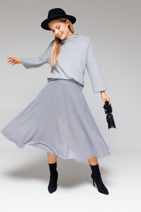 Юбка-колокол на подкладке с притачным поясом.В боковом шве застежка на потайную тесьму-молнию.