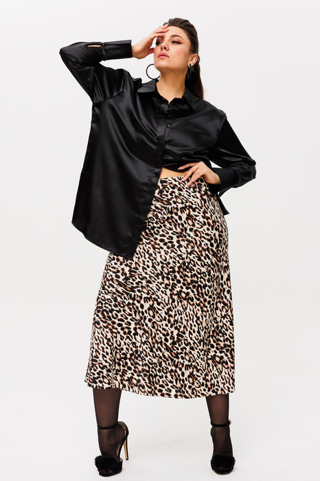 На модели в юбке цвета «светлый лео» жилет из эко кожи 1502.1, рубашка из атласа 1503 и топ 1440.